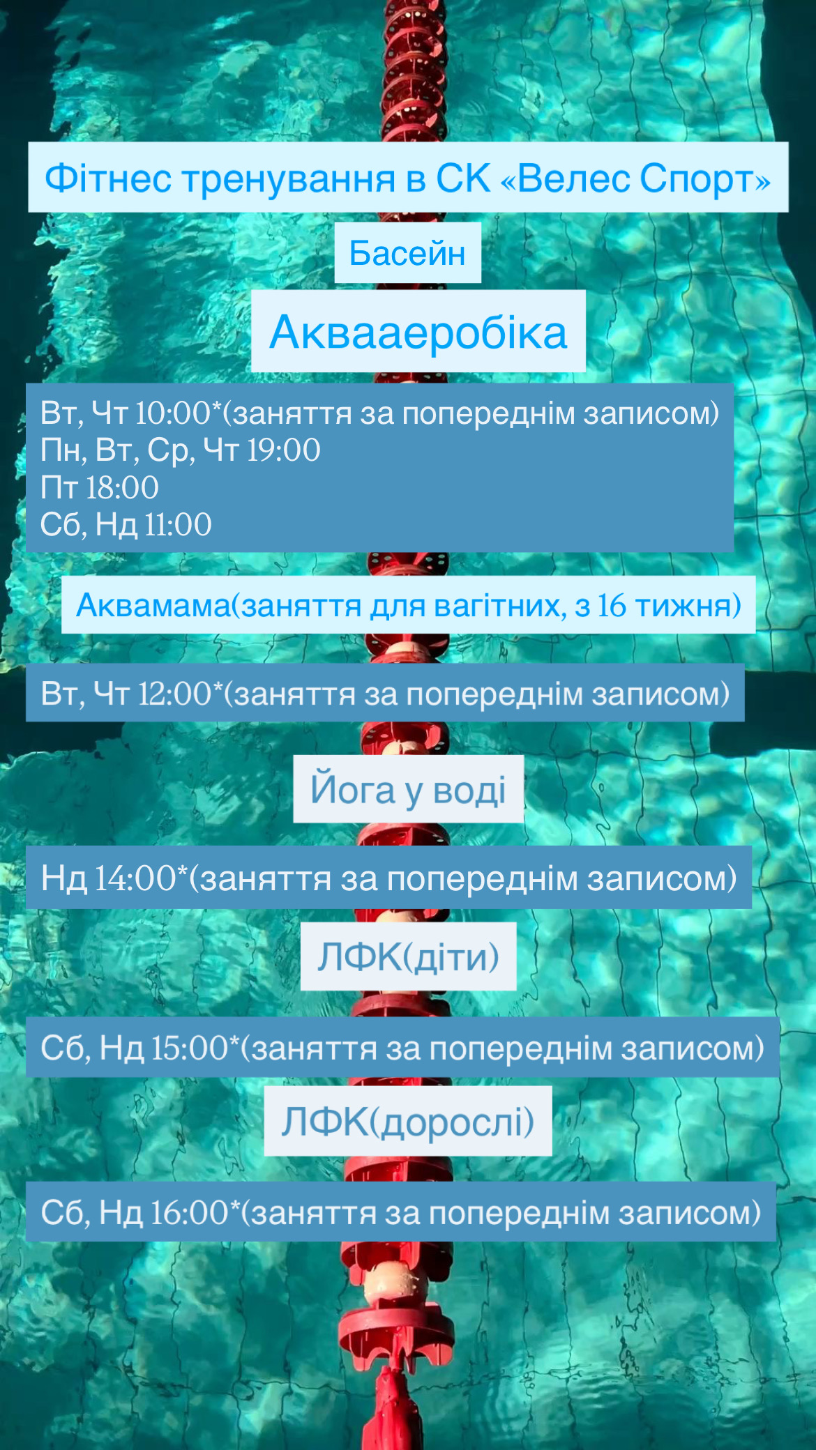 Спортивний (25×10 м), дитячий та грудничковий басейни. Програма Аквамама для вагітних.