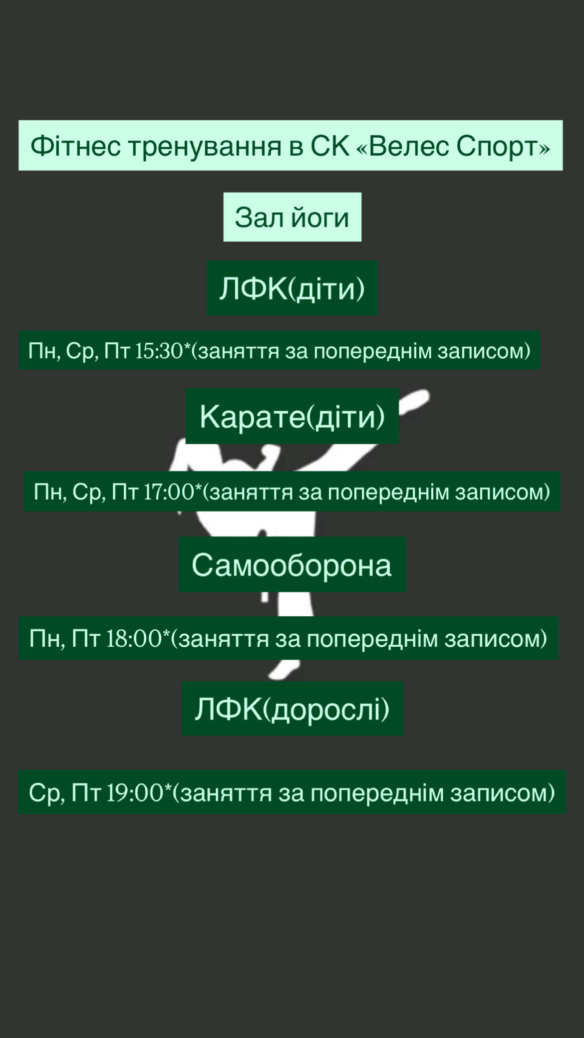 «Велес Спорт» забезпечує послуги на будь-який смак. Наш центр призначений для занять різноманітними видами спорту та фітнесу.